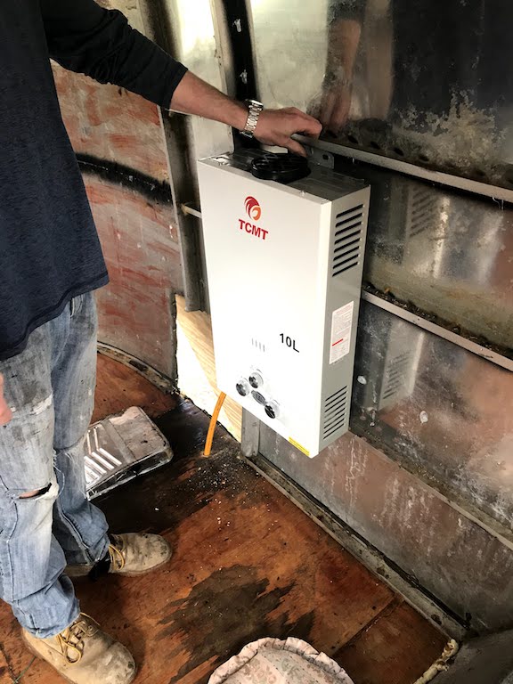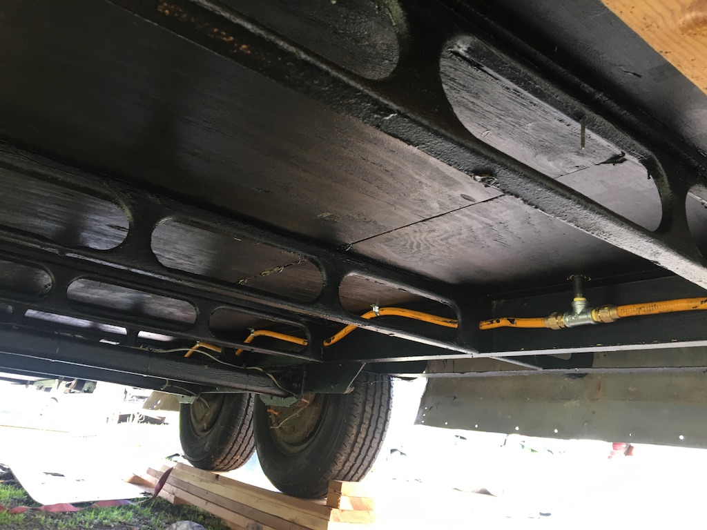 The gas line is simple to use. We had a 25 foot spool that we began running from the two tank hookups in the front (installed prior) down along the frame with a T junction underneath where the kitchen range would be. We then ran solid black pipe up through the floor so there was a mount for the connection to the range. From the T junction, the line continued running back to the bathroom area, where the hot water heater would be located.