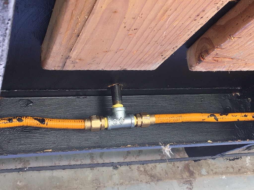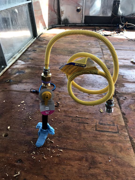 We had two choices when choosing a material for the gas line. One choice was black pipe. This is a solid conductor. Our other choice was corrugated flex line, which was way more flexible. We picked the flex line route- not just for ease of use but for reduced weight and cost.
